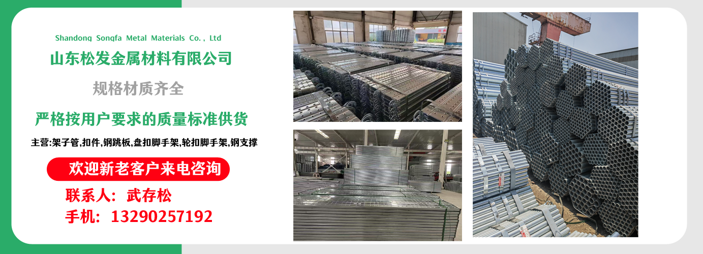 山東松發(fā)金屬材料有限公司主營架子管,扣件,鋼跳板,盤扣腳手架,輪扣腳手架,鋼支撐生產(chǎn)廠家。本廠專業(yè)生產(chǎn)銷售。  建筑用架子管、 主要用于房建,橋梁,鐵路,公路,地鐵,水庫,隧道,支撐。  架子管,扣件,鋼跳板,盤扣腳手架,輪扣腳手架,鋼支撐的優(yōu)越性及應(yīng)用“ ”產(chǎn)品因具有結(jié)構(gòu)簡單合理、設(shè)計(jì)巧妙、使用方便、安全、快捷、易于運(yùn)輸、儲(chǔ)存、維護(hù)簡單等特點(diǎn)。  公司一貫堅(jiān)持“質(zhì)量,用戶至上,優(yōu)質(zhì)服務(wù),信守合同”的宗旨,憑借著高質(zhì)量的產(chǎn)品,良好的信譽(yù),優(yōu)質(zhì)的服務(wù),產(chǎn)品暢銷全球。歡迎廣大客戶來電洽談,共同發(fā)展,共創(chuàng)輝煌!  山東松發(fā)金屬材料有限公司秉承誠信服務(wù)、恪守信譽(yù)的宗旨,在同等的質(zhì)量下,保證以最低的價(jià)格,最完善的服務(wù),最高的信譽(yù)來答謝各界朋友的支持和厚愛,歡迎您的來電、咨詢,我們將竭誠為您服務(wù)!...